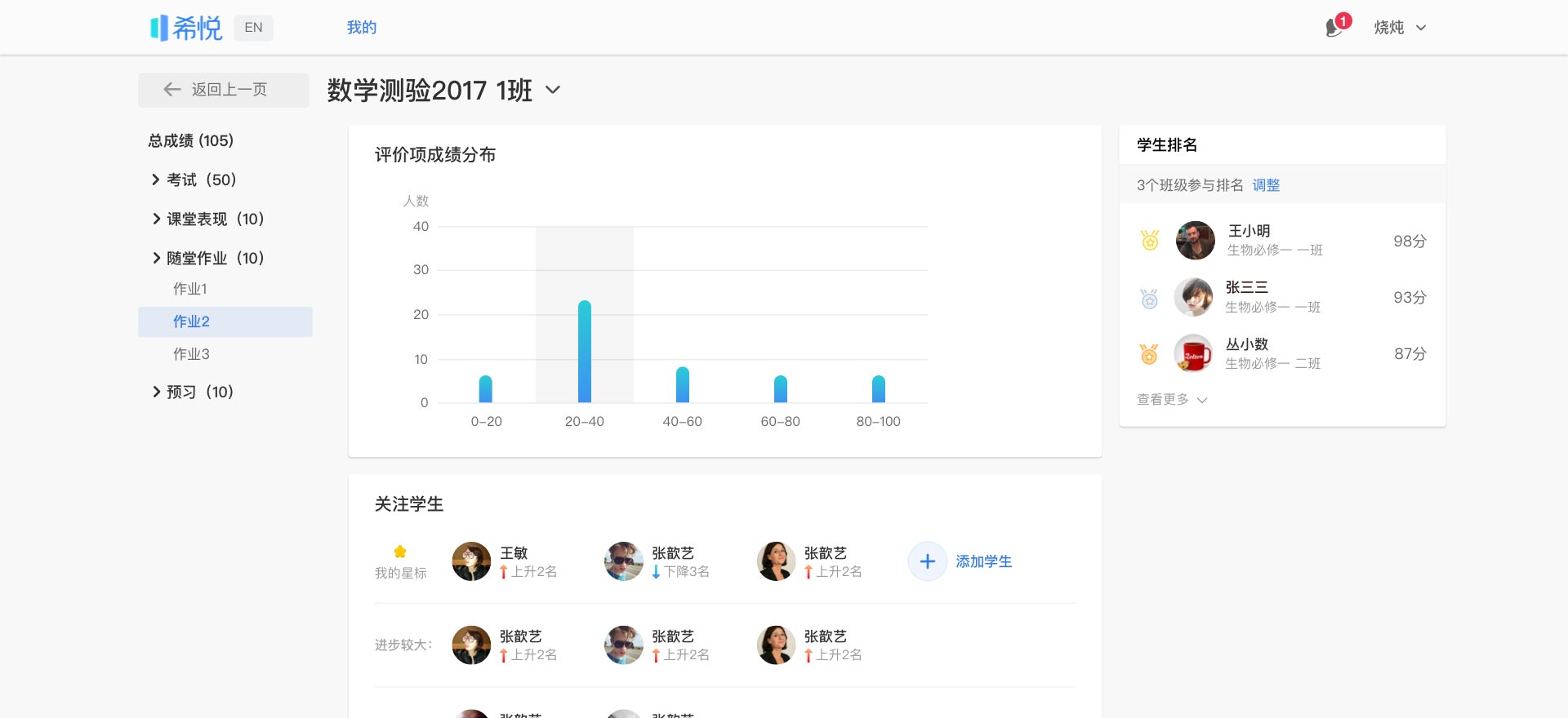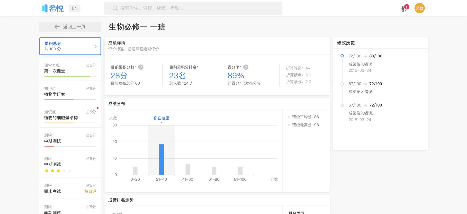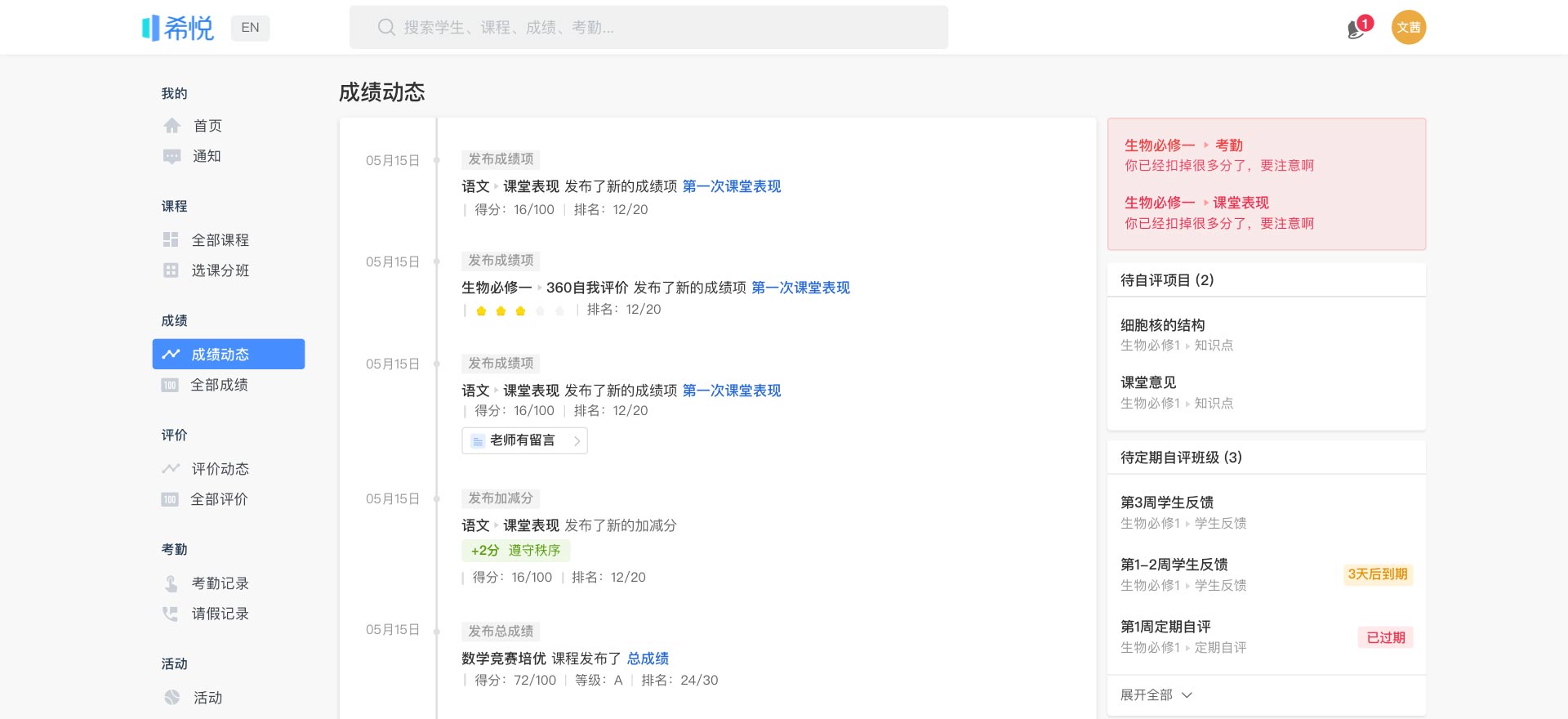 希悦自动汇总学生的各科目成绩并折算出相应绩点,为学生提供已修学分、课程成绩、年级排名、成绩变化折线图等重要信息,让学生全面掌握自身学习进度,帮助教师迅速了解学生成绩动态。