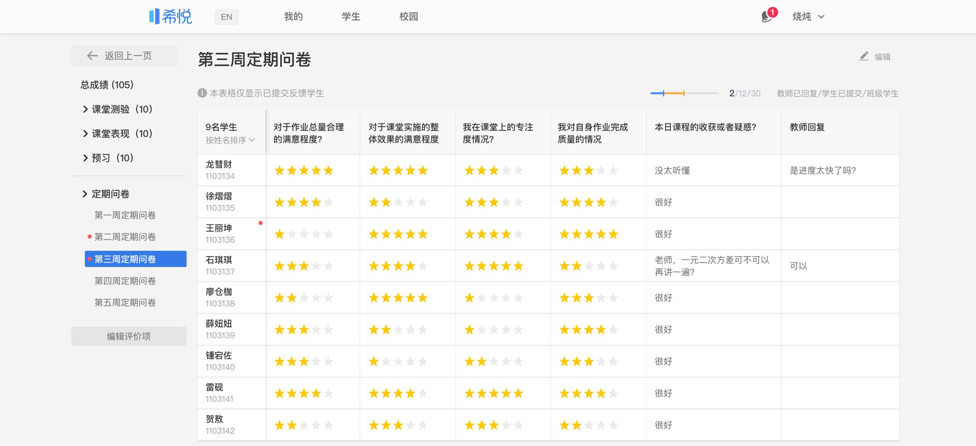 希悦评教模块内置多个科学的评教模板,支持同一门课程在一个学期内进行多次评教,为教学管理提供针对性数据反馈,帮助校方实时了解教学情况,快速做出应对。