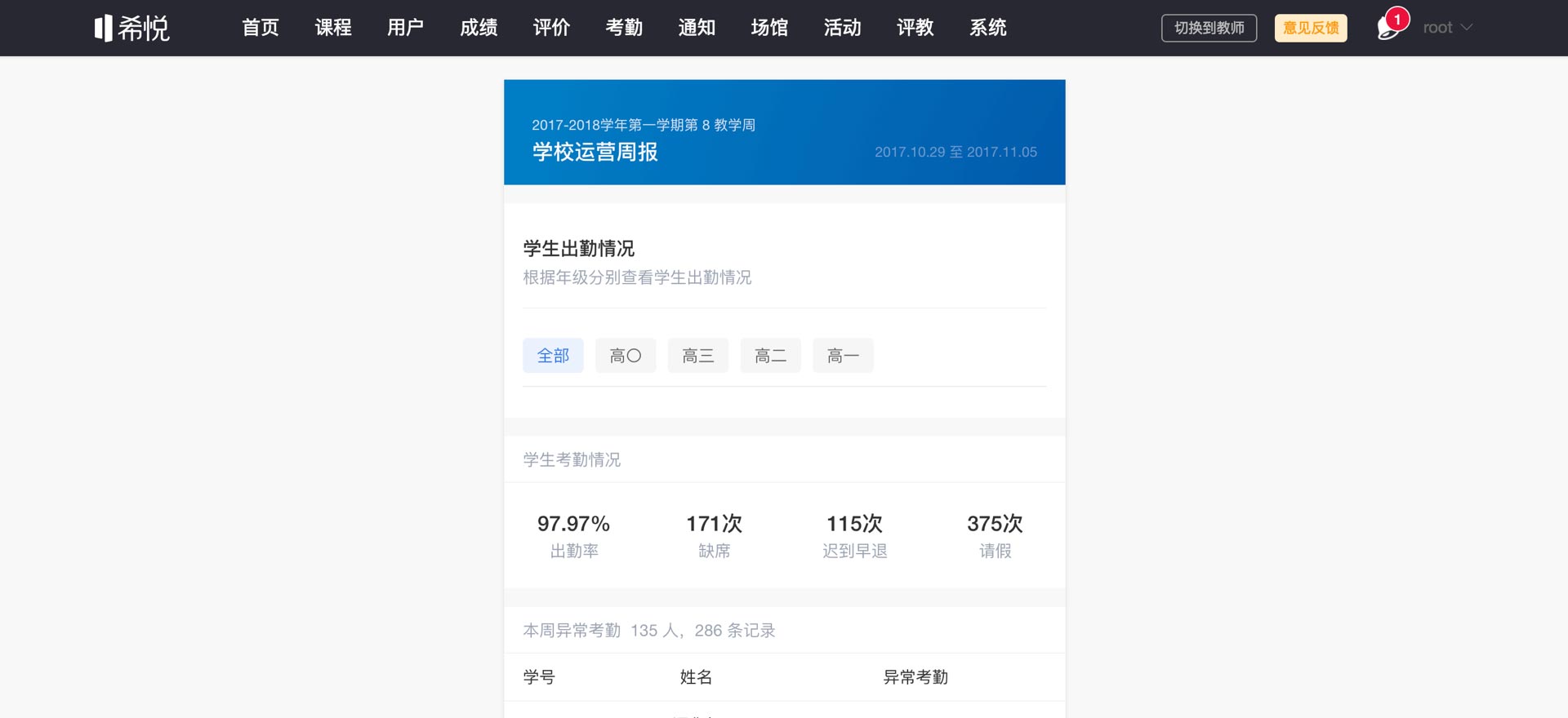 根据系统的使用情况,希悦每周从海量的数据中提炼出最重要的信息,用图表化方式加以呈现,为教师、教务、校长、家长分别生成智能周报,为学校与师生的决策提供最坚实的数据依据。