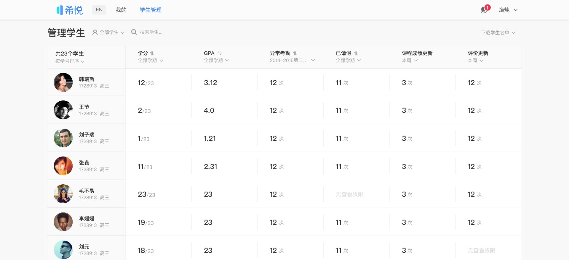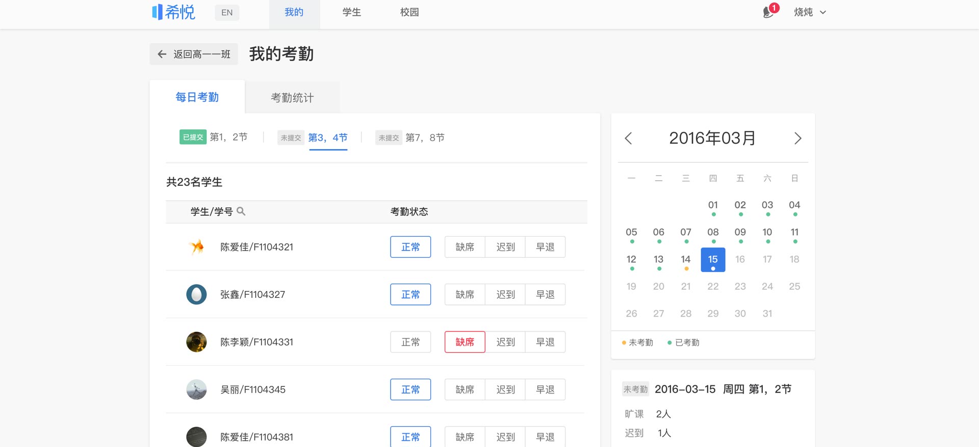 希悦专注于解决走班制下的校园管理难题。通过精细的考勤管理,多渠道群发通知,创新的课程评教等功能模块,避免行政班概念被打破后校方通知难、考勤难、评价难的困境,让走班真正”活“起来。