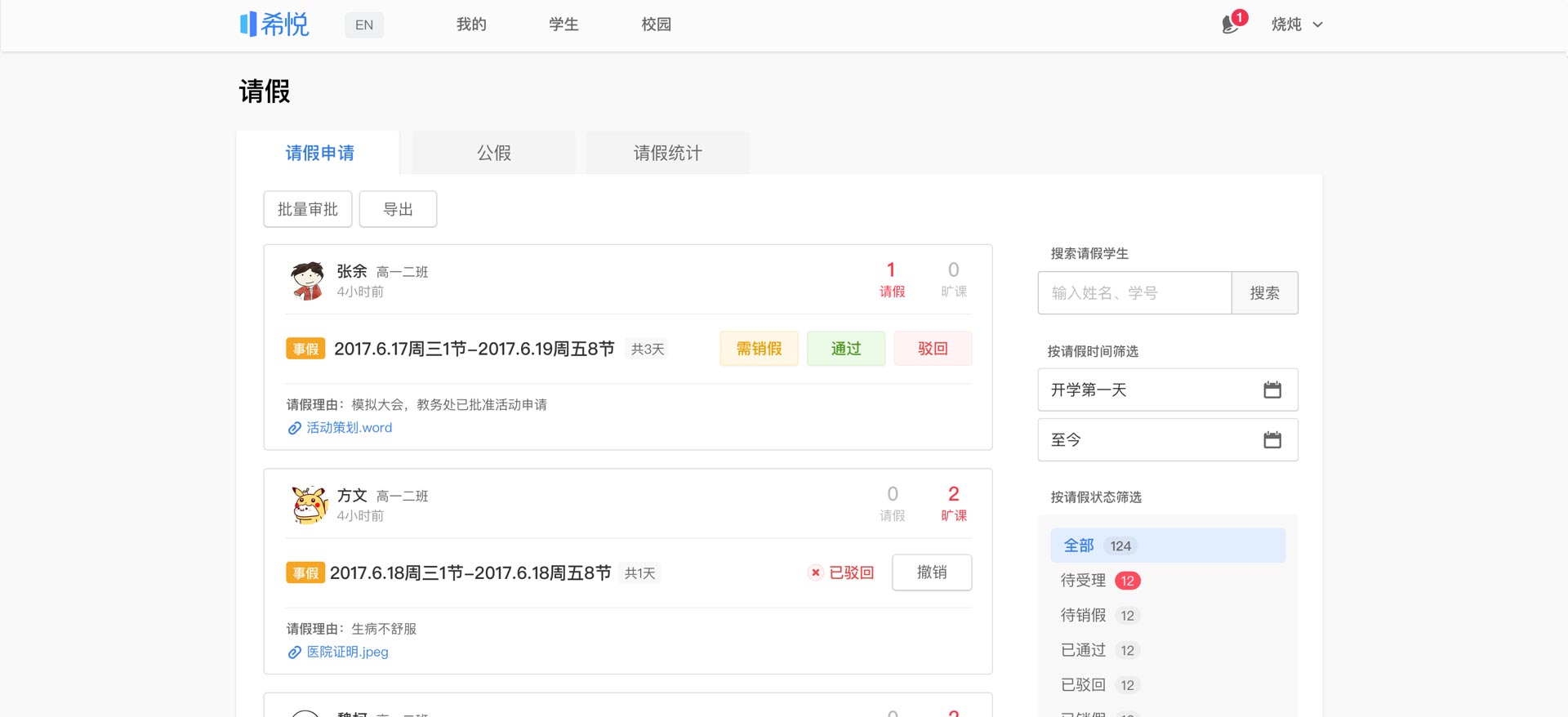 学生的请假时间可精确到每节课。请假需发送假条阐明原因,还可依据需要上传证明附件。教务审批事假时,可通过驳回请假、通过请假、等待销假三种模式,灵活应对各种请假场景。