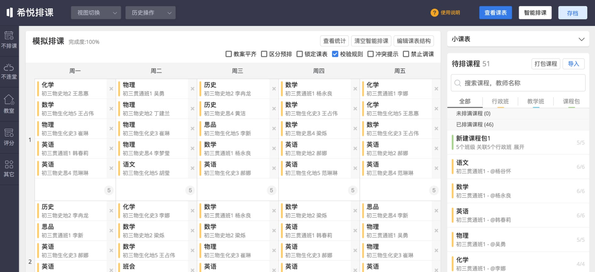 选排课模块支持按年级、学科、层次、类型采取不同的排课模式,先由自主专利的机器学习算法进行自行排课,通过排课教师的反馈让算法“学习”学校的排课偏好,并允许排课教师随时干预排课结果,让排课结果真正符合实际教学安排。