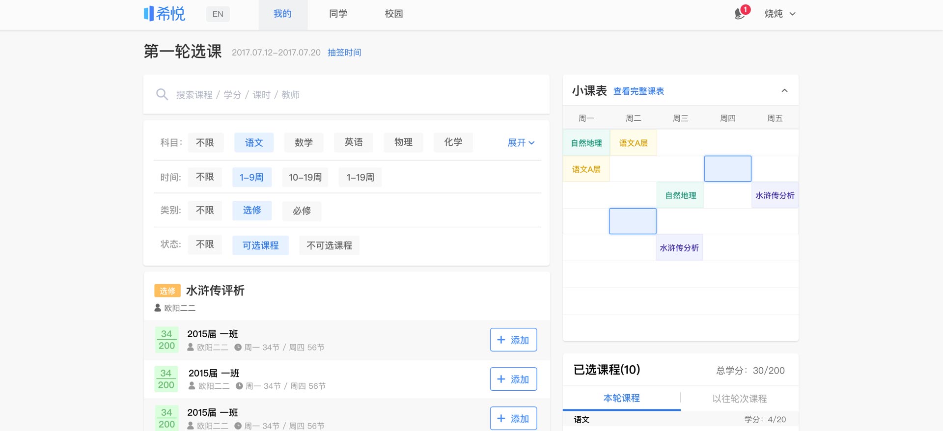 除了传统的先选先得抢课模式外,希悦同时支持定时抽签选课模式,结合选课币、给教师留言、师生双选、多志愿选择多种功能,避免机械化抢课的弊端。学生可以通过多种方式争取自己喜爱的课程,真正实现学生的课,自己做主。